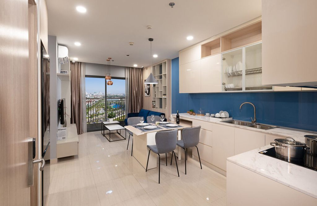 Bàn giao căn hộ Hoàn thiện Đồ Liền Tường bao gồm trần, tường, sàn, bếp, thiết bị vệ sinh, hệ tủ (lavabo, tủ quần áo, tủ bếp). Hệ thống Nước Nóng Trung Tâm và Điều hòa Multi. Cấp độ vật liệu tương đương các phân khu cao cấp của Vinhomes (như Park Hill, Green Bay, Vinhomes Central Park…).